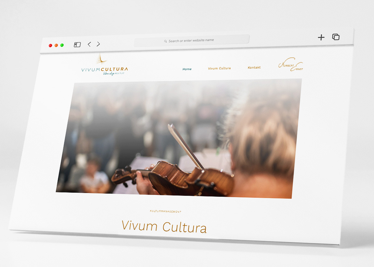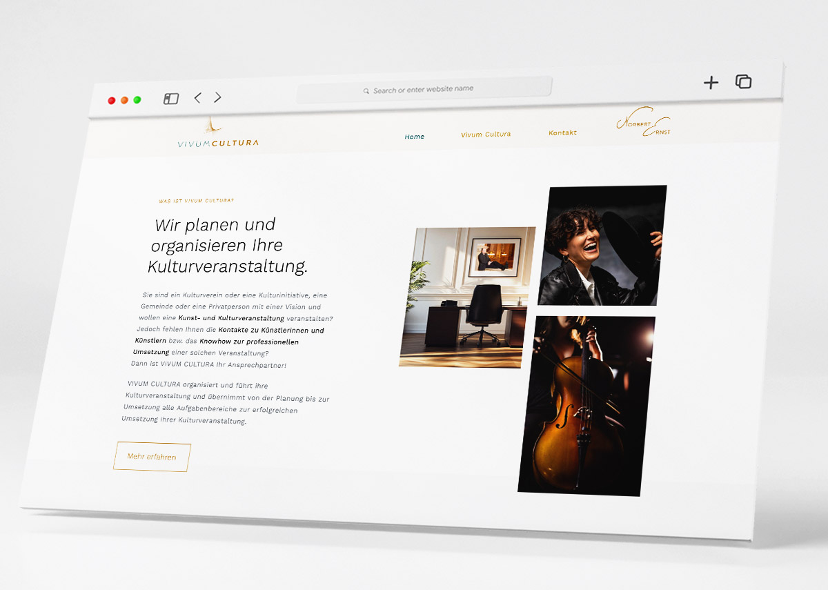 Für vivum cultura, einen vielseitigen Dienstleister für Kunst- und Kulturveranstaltungen, durften wir das visuelle Fundament gestalten. Von der Logoentwicklung bis zur Umsetzung einer klar strukturierten und modernen Website lag die kreative Verantwortung bei uns. Die Website vermittelt auf einen Blick, wofür vivum cultura steht: professionelle Planung und Organisation von Kulturprojekten – für Gemeinden, Kulturinitiativen und engagierte Privatpersonen.